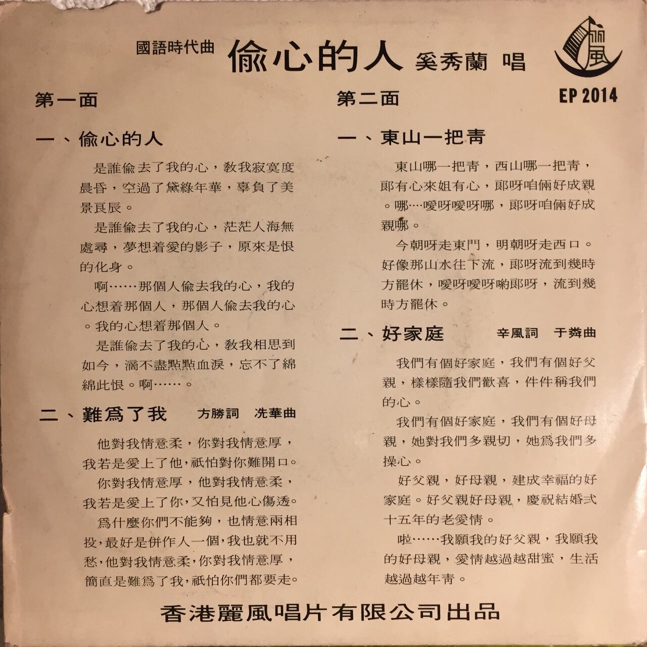1970年代から80年代にかけて活躍していた香港の歌手の4曲入り7inchEP。香港盤。正確な時期は不明ですが、1970年代前半にリリースされたものと思われます。