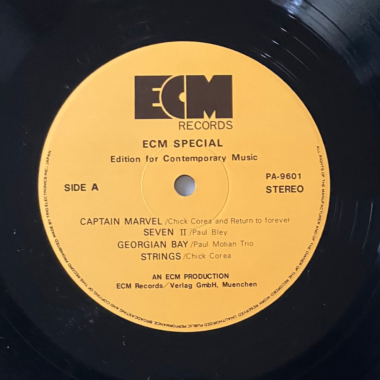Return to Forever(リターン・トゥ・フォーエバー)"Captain Marvel"のアルバム収録別ヴァージョンで疾走感のあるブラジリアンフュージョン曲A1やタブラのグルーヴが渋いB1のPaul Motian Trio(ポール・モチアン・トリオ)など要チェックですが、ほかチック・コリアやキース・ジャレットのソロなども収録しています。