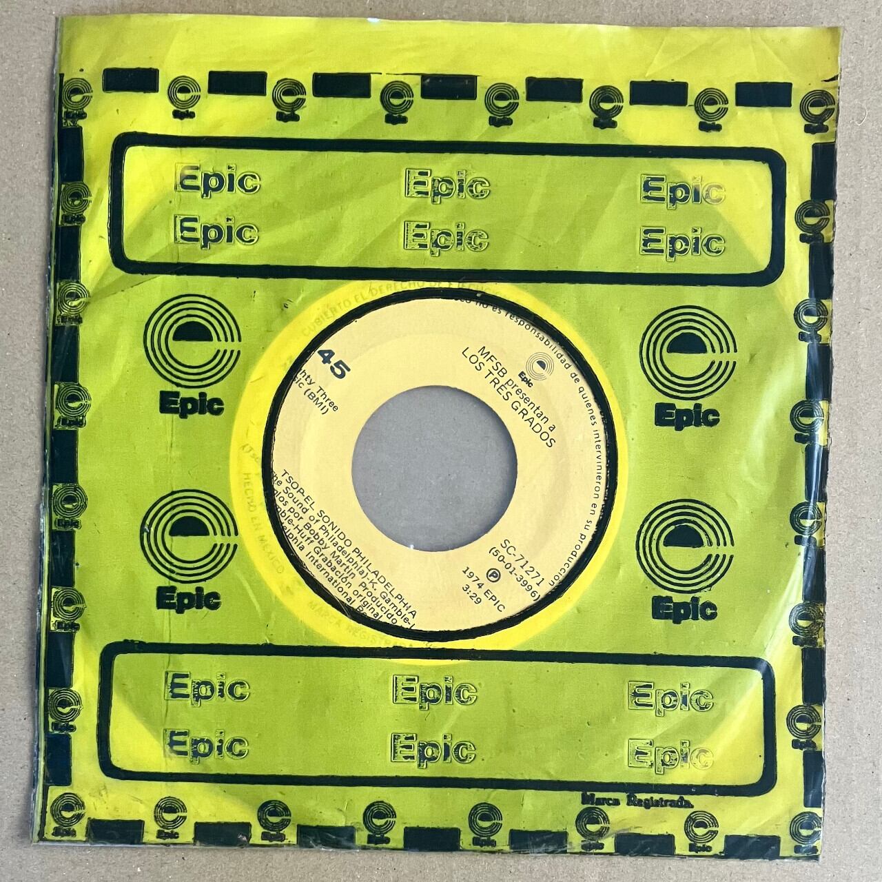1970年代に人気を博したフィラデルフィア・ソウル全盛期のヒット曲に携わった演奏集団MFSB(abbreviation for Mother, Father, Sister, Brother)の代表曲にして、ソウルトレインのテーマ曲(タイトルにThree Degreesのクレジットがありますが、一部コーラスのみのMFSBのver)でもある The Sound Of Philadelphia を収録した7inchレコードのメキシコ盤。